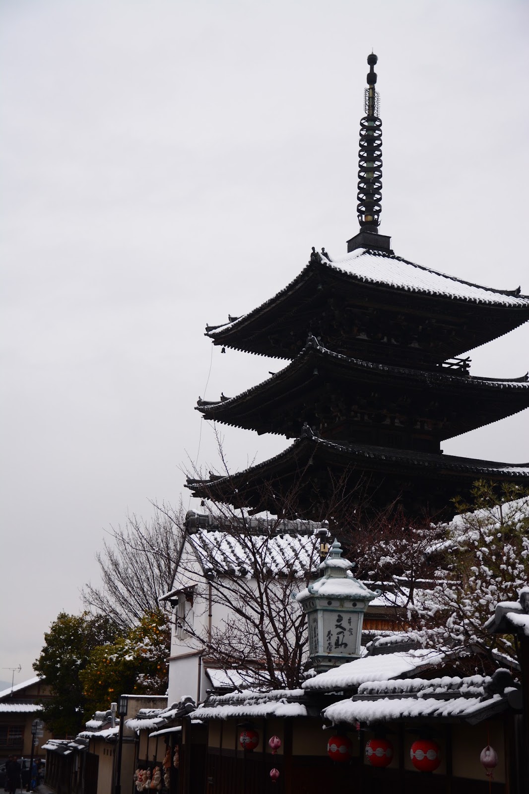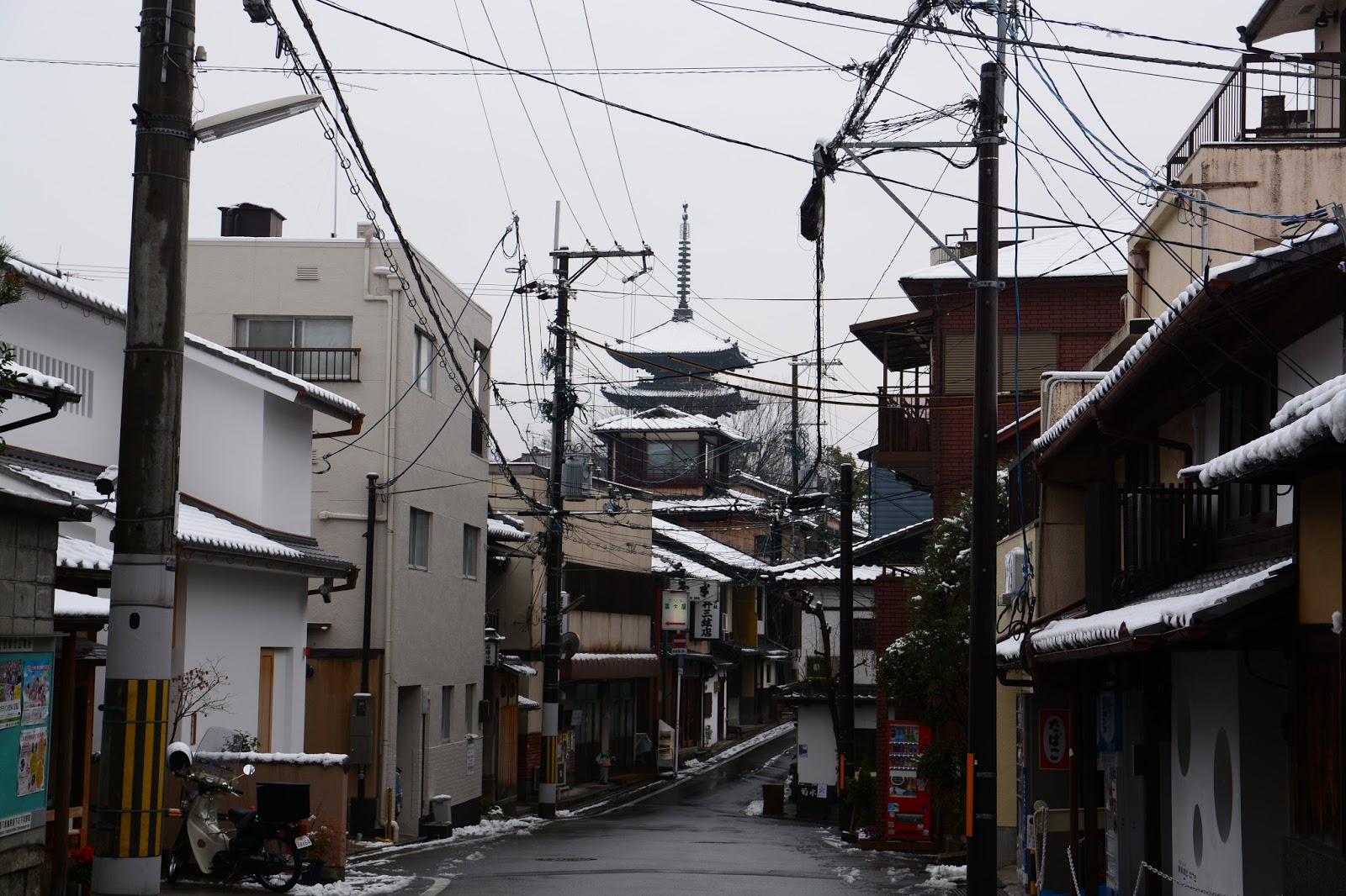 一路祇園へ。こちらはうっすら屋根に積もる程度のみぞれ混じりの降り。帰りの新幹線まで駆け足で見て回れます。大きい道路を避け、小道を選んで探検開始です。