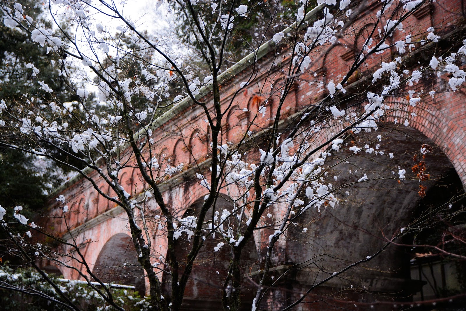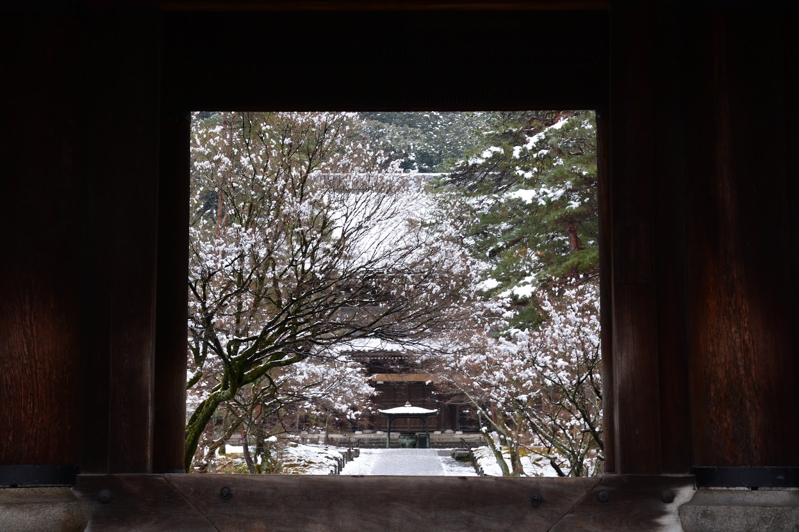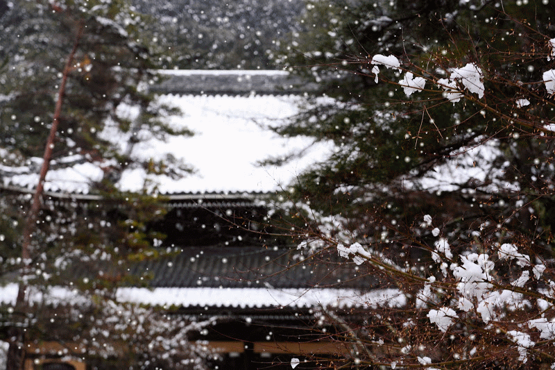 清水寺から引き返し五条まで降り、一気に蹴上まで移動。雪は止んでいるのですが、木々に積もった雪が風に舞ってまるで花吹雪に。夕刻の南禅寺へ。
