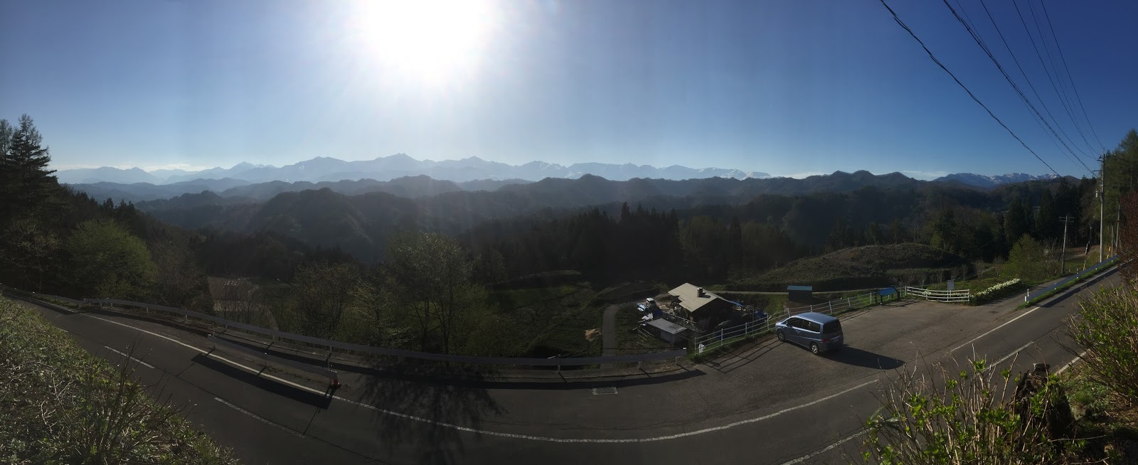 一度、家へ帰りカメラから写真を抜き出してちょい遅めの昼食を。ペンネペペロンチーノを自作。食べながらネットをチェックしていたら白馬の雪形の話題が。先日の早朝見たアルプスの山々が目の前に。早々に昼食を片付け、一路小川村へ。かなり昔通った国道の山道を通り、鬼無里まで。この山道、すごすぎ!そういえば職場の人たちが「あんな道は通らない」とか「バスが来たら逝ける」とか「オリンピック道路」とか言っていたな~