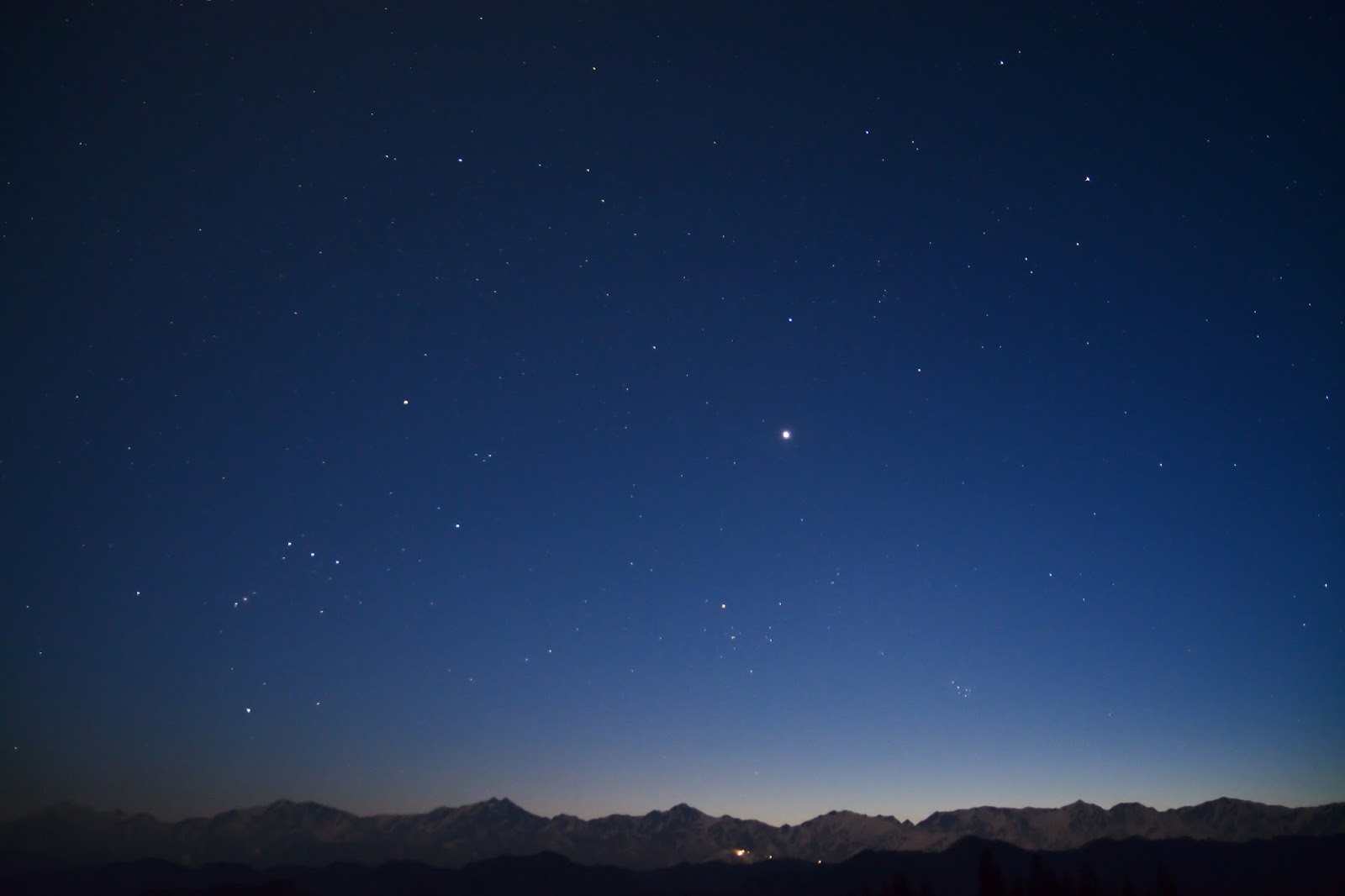 星にピントを合わせると山がぼけるし、山肌は月明かりが功を奏してうっすら見えてきてます。そして冬の星座の代名詞オリオンがゆっくりアルプスの山々に沈んでいくのが目の当りに見えたのが感動でした。
