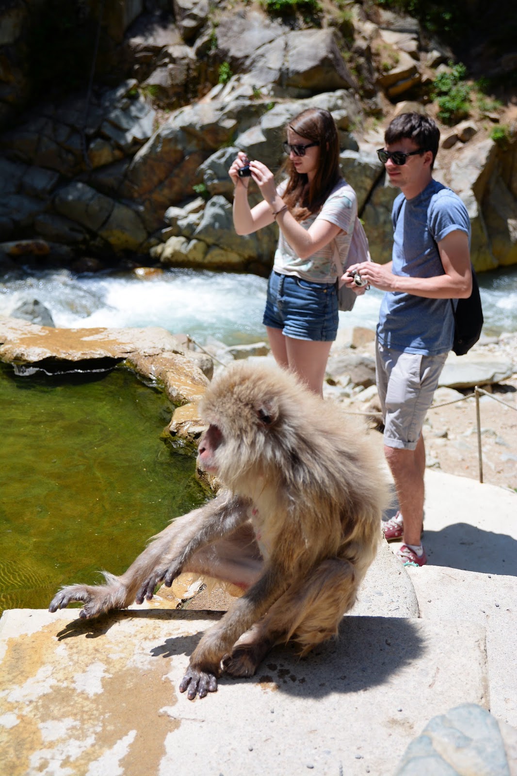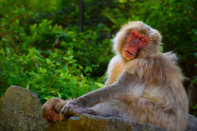 木陰で涼んでいたり、昼寝をしていたり。雪の中で湯気をバックに温泉に入っている猿たちをイメージしていたのですが、今の季節だと無理ダナ。とは言うものの、温泉に向かう山道のすぐわきでこの有り様。