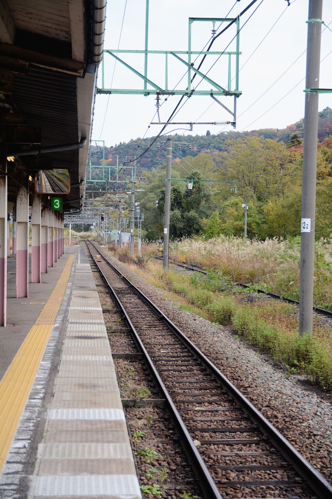 列車を乗り継ぎ、一路直江津まで。ホームの端に喫煙所があるのが新鮮!