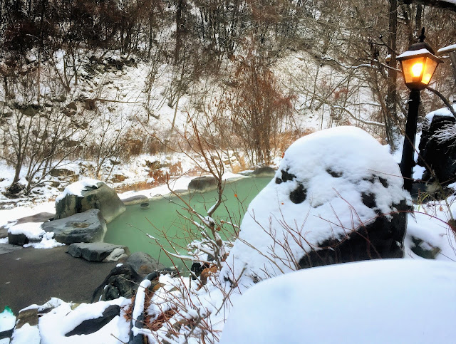 ちょい温めの浅い露天風呂。湯の花は黒い繊維のようなもの。目の前の雪山を眺めながら満喫しました。