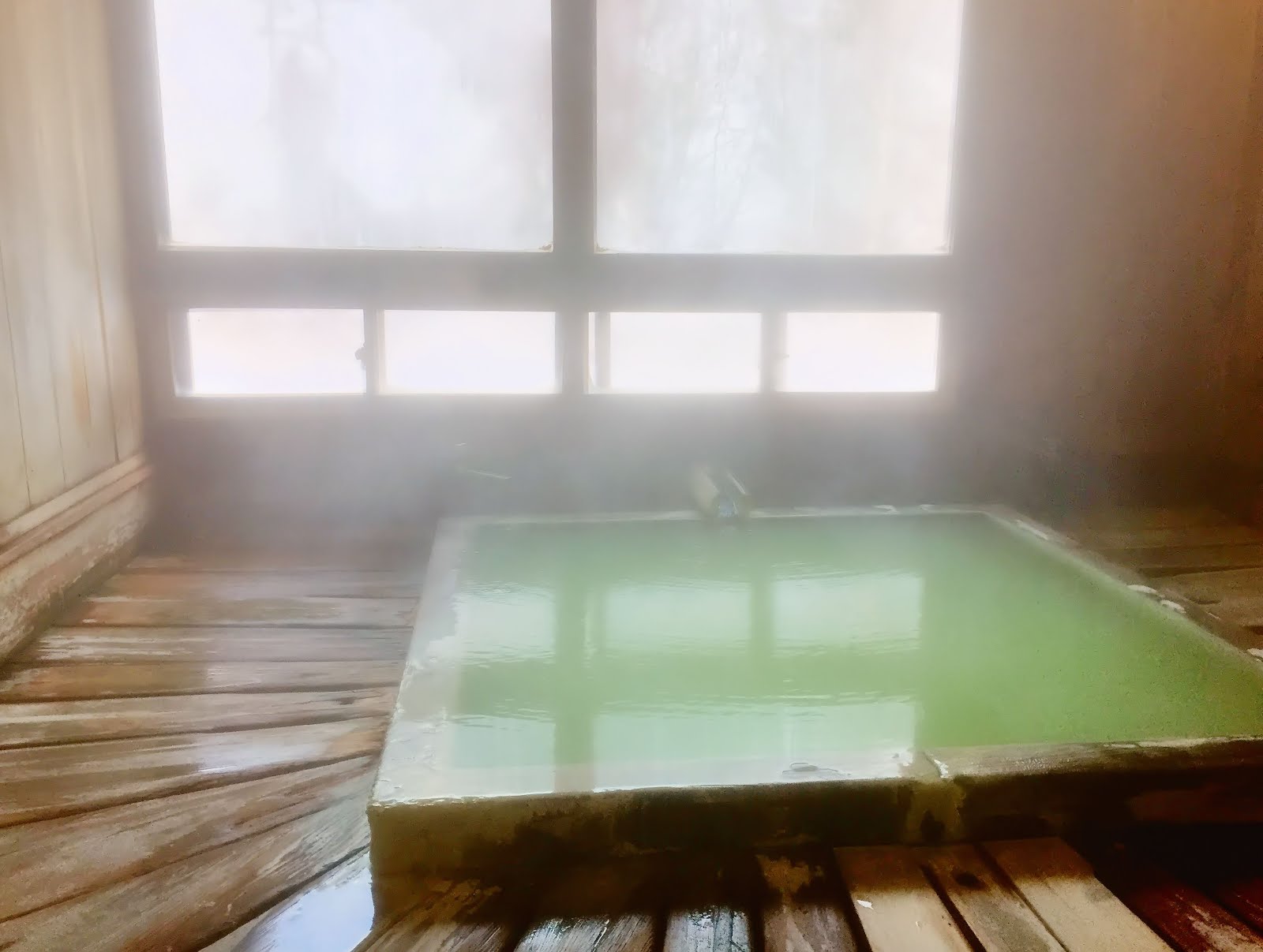 こちらは熱めのお湯で、入ると肌がチリチリするくらい。しっかり硫黄の香りに包まれて芯からじっくり温まりました。こちらは結構深めのお風呂です。