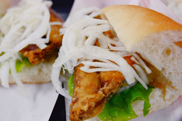 定番の米山SA下りの名物サバサンドを食べても雪は止みません。
