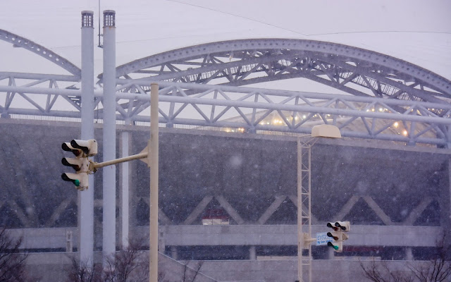 ビッグスワンスタジアムもこの通り。この雪の中を東へ西へ打ち合わせです。
