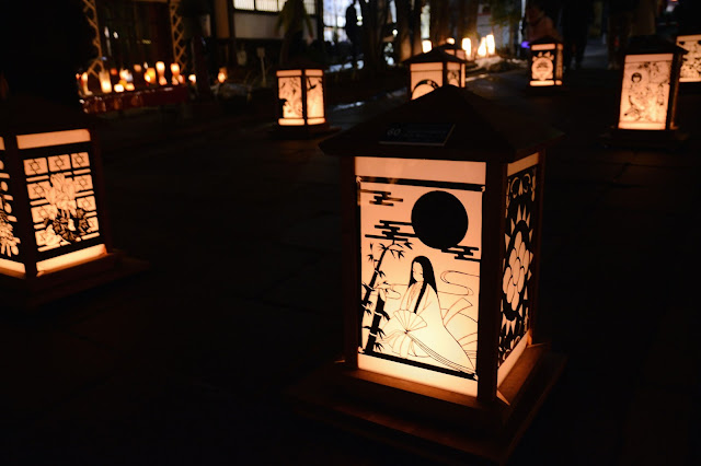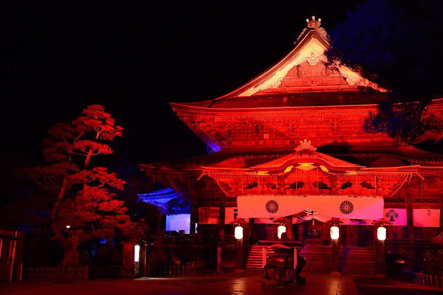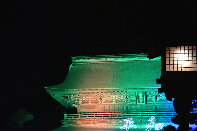 本堂がライトアップされ、山門にはプロジェクションマッピング。参道の石畳には数々の灯籠が置かれ盛り上がっています。