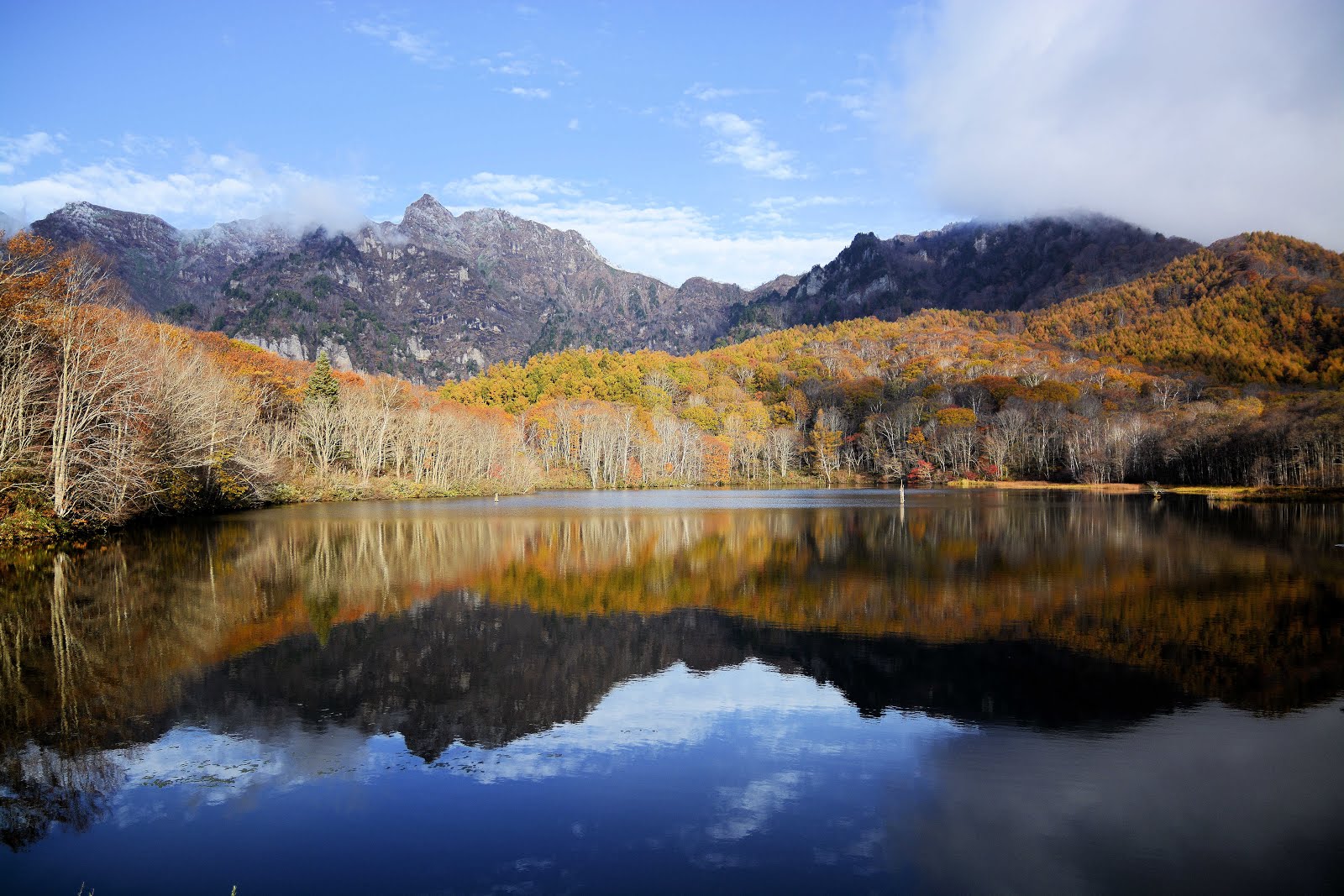 今朝の鏡池。朝のうちは雲が出ていて心配されましたが、どうにかこのショットをゲット。
