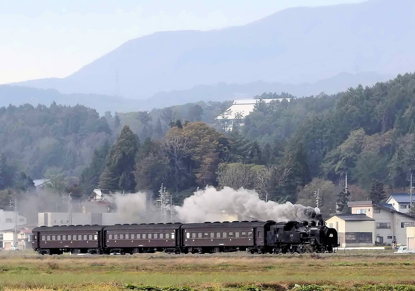 遠くで汽笛の音が聞こえ始めました。山々に汽笛が反射し、とても壮大です。