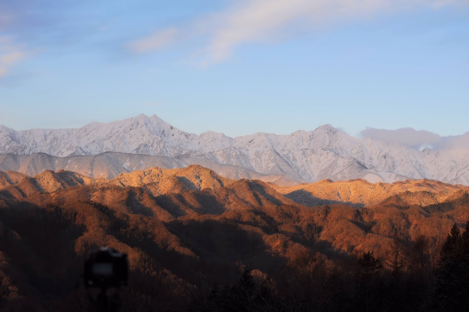良い色に焼けています。でもあっという間に終了。そして太陽が上がってくると手前の稜線にも光が当たってきます。